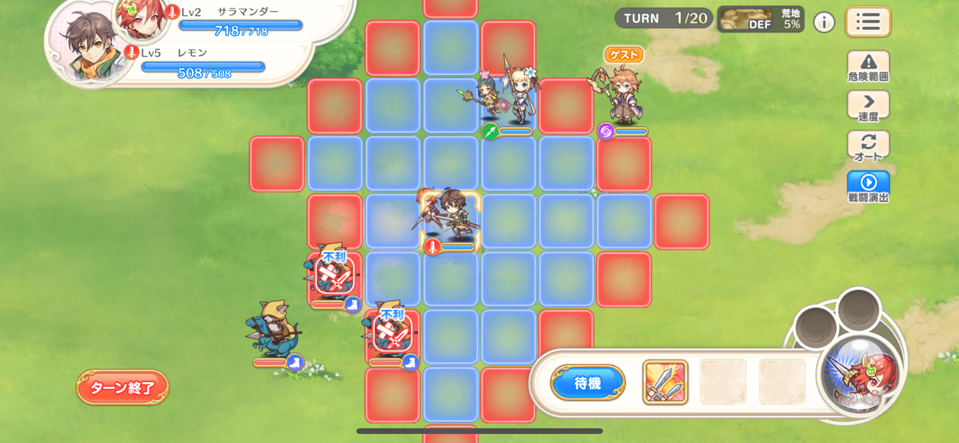 バトルに慣れるため、マスの移動・スキル範囲・クラス相性などを理解してから進めると後々楽になります。